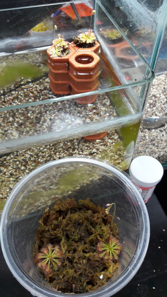 塑膠杯裡的是養在外面的 花梗是他的兩倍高 花也比較大 葉片也長得比魚缸裡的大了