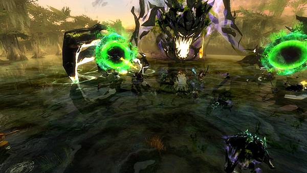 接著 會在三個方位(沼澤以北/西/東)各出現三組綠門 綠門裡會爬出小怪 源源不絕 所以要先打綠門 不要傻傻的清小怪 三個綠門一清掉 小怪就會一起死亡
