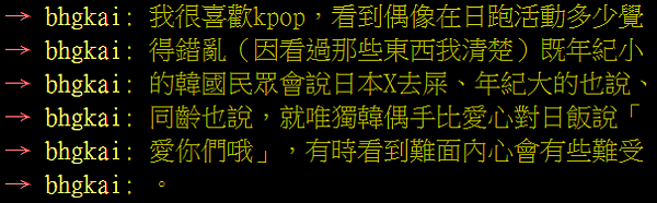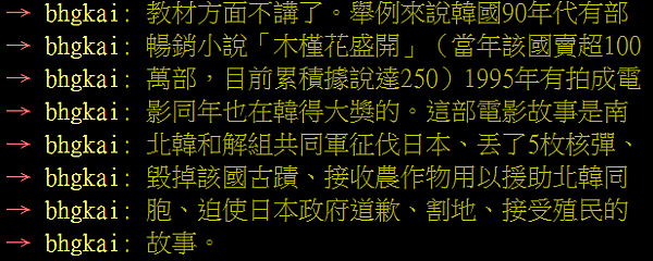 但我其實不認為他們會跟其他韓國人有甚麼不同 尤其7個都是土生土長的韓國人 受的教育.......哼哼 原爆T恤事件發生後 間接得知了誇張的韓國教育...或說 洗腦教育 老實說跟對岸跟早期的台灣真的沒甚麼不同 但令人驚訝的是 他們的政府還在這麼做...ex. 學校門口地上畫日本旗幟 要學生們踩過去 這讓他們長大後只要做任何汙辱日本的事情都會被稱讚 最誇張的就是某部電影 內容是韓國後來變的強大 殖民日本 而這個電影還得了一堆獎...在我看來就是自嗨獎