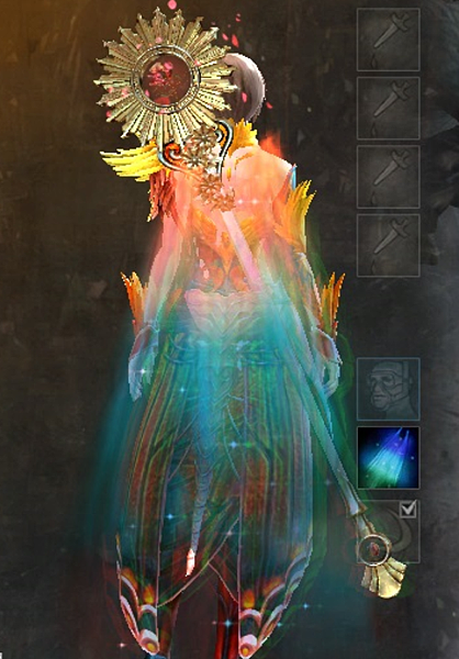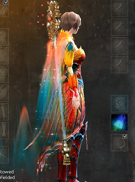 話說WOW打死不出籠后的透明披風給玩家用 結果前陣子倒是GW2出了個半透明的極光披風 看示範 有4格可以染 上次看到有天才染成七彩的 應該是因為有些特殊染料有漸層效果 才有辦法用四格染出7種顏色XD