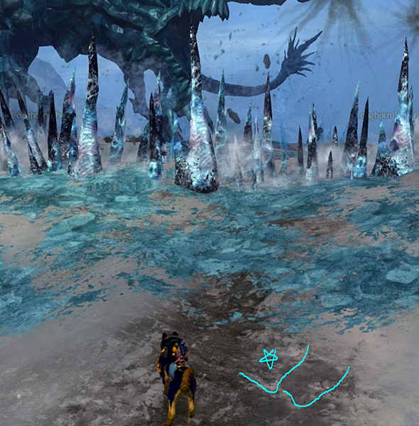 (我自己是認兩個到三角的輪廓來判斷位置 大約是在星星的位置 偏一點都可能會被擊飛 這是冰凍區的邊界 再前面一點就會開始有冰凍debuff)